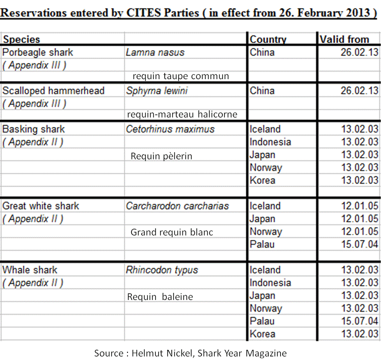 Voici un tableau qui montre toutes les réserves qui ont été saisis par les parties à la CITES (pour les requins), en vigueur à partir du 26 Février 2013. »