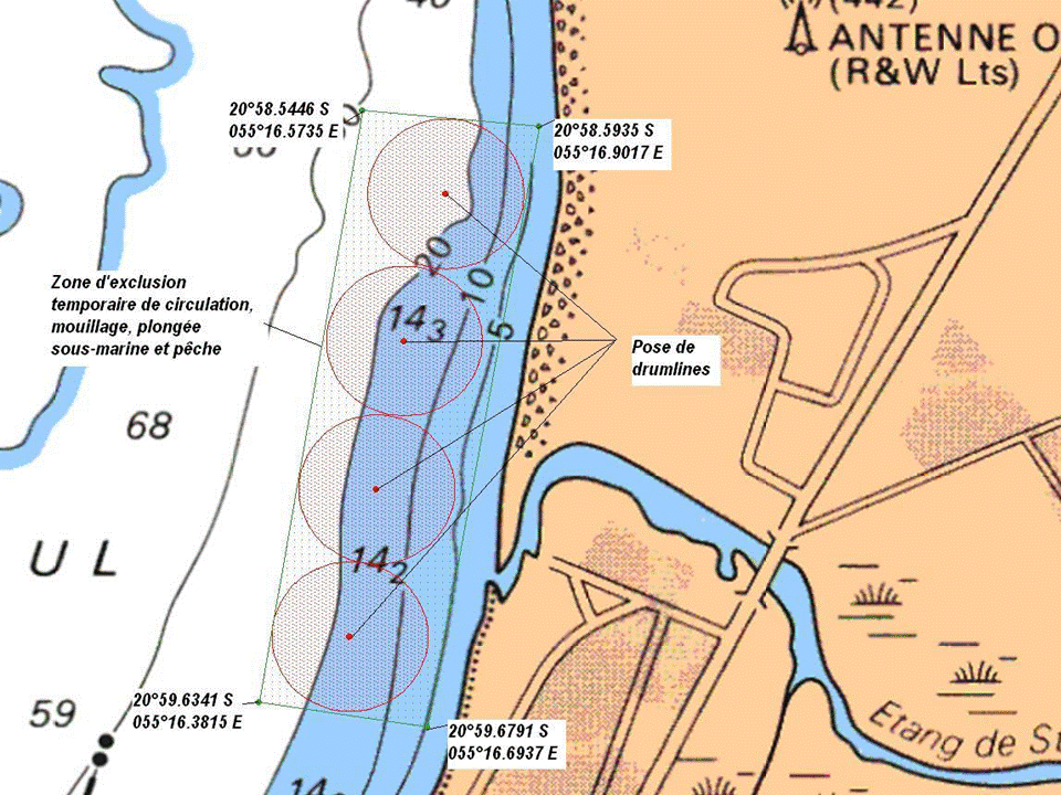 Dans le cadre de sa phase pilote, notamment destinée à étudier la faisabilité d’une technique de pêche dite « de protection », des « drumlines » (lignes verticales fixées au fond), au nombre de 4, séparées de 500 mètres les unes des autres, seront immergées en Baie de Saint-Paul au niveau de l’embouchure de l’Etang Saint-Paul en zone côtière (cf. carte page suivante). Cette zone servira de site d’expérimentation in vivo pendant une période d’une durée minimale de 2 mois. Les premiers essais de pêche et de déclenchement du système innovant de « drumline intelligente » (au moyen de bouées électroniques avec système d’alarme de déclenchement en temps réel) seront engagés dans la journée du 14 janvier 2014.