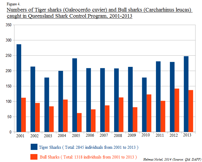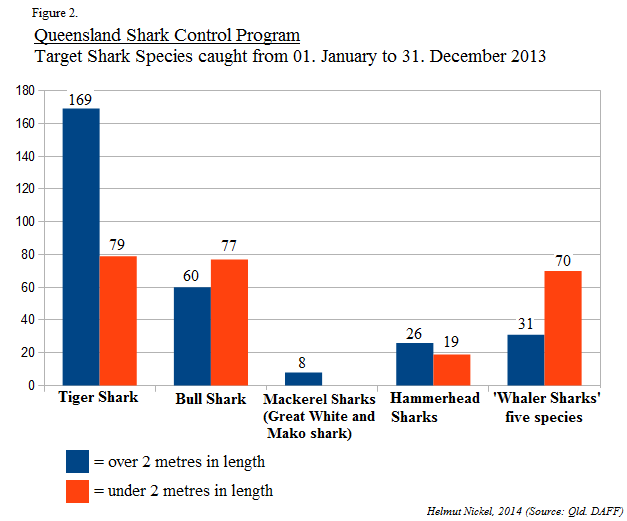 Avec plus de 56 pour cent de toutes les captures, deux des espèces de requins les plus dangereux sont en majorité représentés dans cette statistique. Parce que les requins tigres sont les espèces les plus couramment capturées (avec 248 individus ou 36 pour cent), suivis par les requins bouledogue avec 137 individus (environ 20 pour cent) .