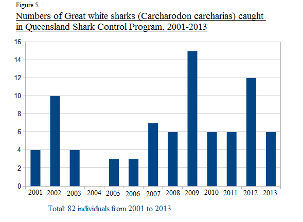 Au cours des 13 dernières années, 82 requins blancs ont été capturés par les filets anti-requin et les drumlines (Queensland) (Fig. 5). Mais il y avait 2.845 requins tigre et 1.318 requins bouledogue capturés au cours de la même période de temps (Fig. 4).