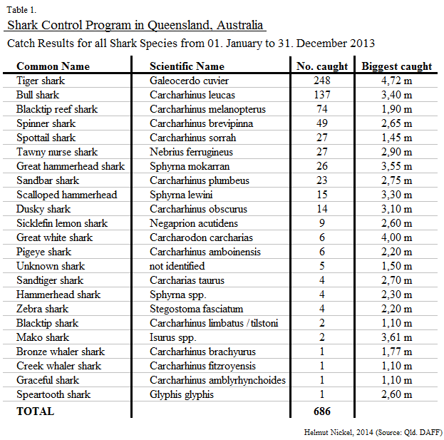 686 spécimens de requins, constitués d’au moins 22 espèces, ont été pris dans les filets et drumlines au large de la côte du Queensland du 01. Au 31 janvier. Décembre 2013 (voir Tab. 1).