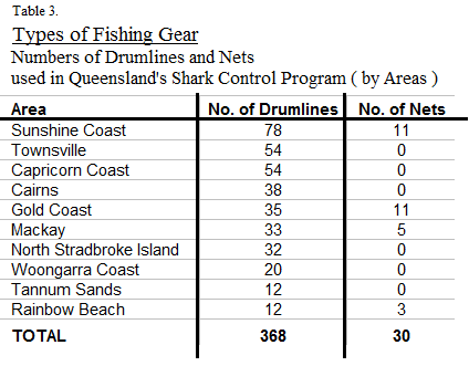 Le programme de contrôle de requin dans l’Etat australien du nord-est du Queensland est censé minimiser la menace d’une attaque de requin sur les humains dans des endroits particuliers. Le programme a été lancé en 1962 et il repose actuellement sur plus de 360 drumlines et 30 filets (voir Tab . 3 ) qui offrent une protection sur 80 zones de baignade et plus de 320 km de côtes .