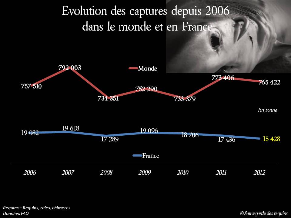 La tendance est à la baisse depuis 2000, cette année a connu le chiffre en terme de captures le plus important depuis 1950. Depuis 1950, les captures enregistraient une augmentation constante et importante pour ensuite voir une baisse générale s’amorcer à compter de 2001 et enfin ( ?) descendre sous la barre des 800 000 tonnes en 2005.