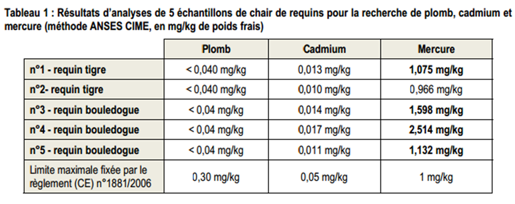 cadmium et mercure, transmis à l’Anses dans le cadre de la saisine par la DGAl, sont présentés dans le tableau 1. Il apparaît que 4 des 5 échantillons de chair de requins analysés ont une concentration en mercure supérieure (jusqu’à 2,5 fois) à la limite maximale fixée par Règlement