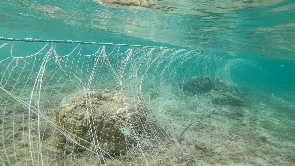 Installé à demeure, sur une trentaine de mètres en direction du platier récifal, il est destiné à pêcher jour et nuit. Que le filet – à mailles fines – se prenne dans le corail et le brise, qu’il capture au passage tous les petits poissons du lagon (balistes, poissons cochers, poissons papillons,….) qui restent prisonniers des mailles, ce n’est visiblement pas leur problème : il faut tuer ce fichu requin juvénile !
