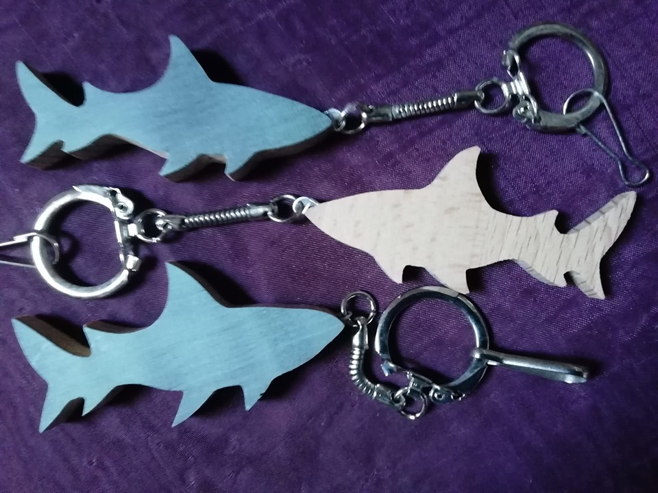 Il nous a élaboré des porte-clés Requin. Chaque pièce est unique et travaillée à la main. Une face bois naturel, et une face recouverte d’une feuille de bois couleur bleue.